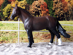 Karolinger wurde aus dem Hannoveraner von Breyer gecustet. Er bekam Langhaar aus Mohair und die Beinstellung wurde verändert. Karolinger ist inzwischen auf Alexandra Seidel-Pyls Silver Ranch eingezogen und wird dort als Dressurpferd eingesetzt. |